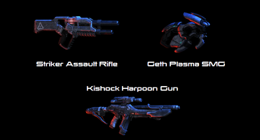 - Striker Assault Rifle: eine kroganische Waffe mit explosiven Geschossen. Die Feuerrate der Waffe kann durch lange Betätigung des Abzugs erhöht werden.